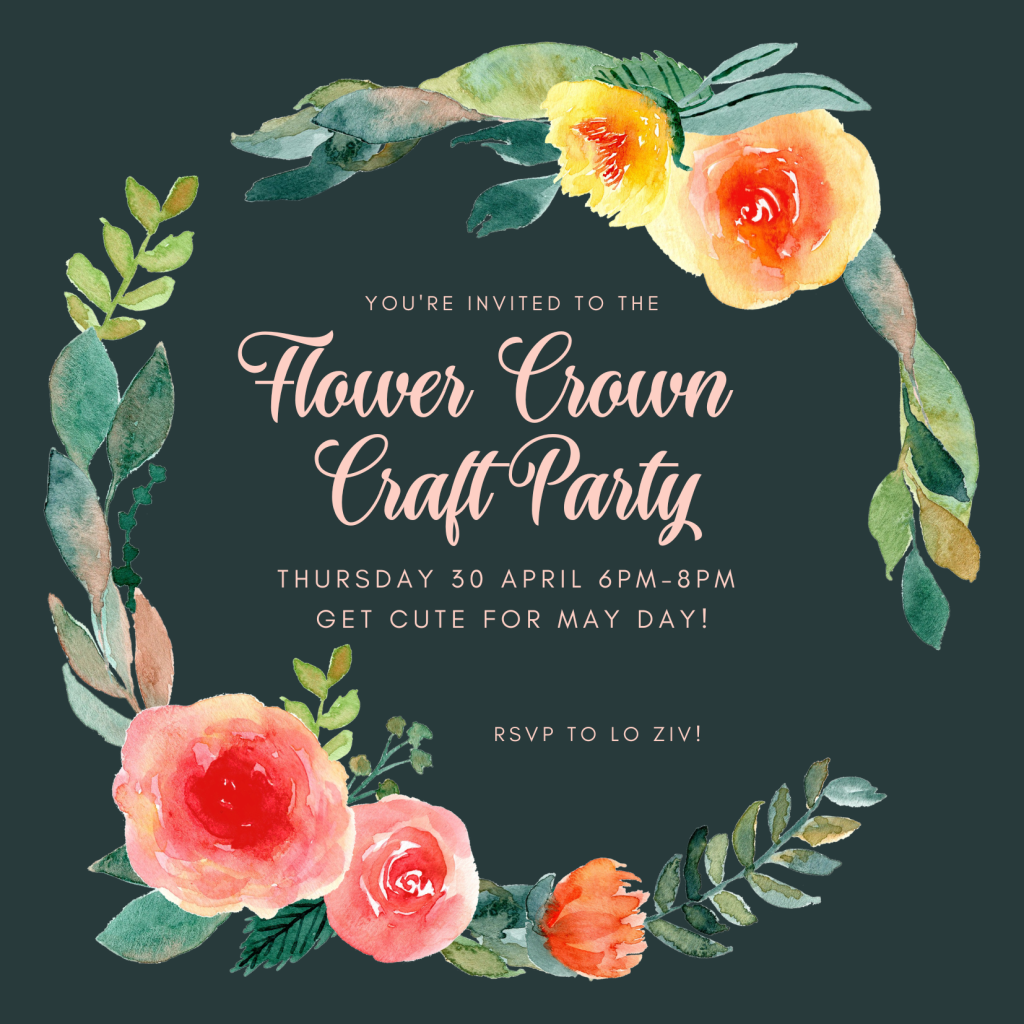 Join us for an evening of making flower crowns. RSVP / register ahead, just so we have enough craft supplies for you.